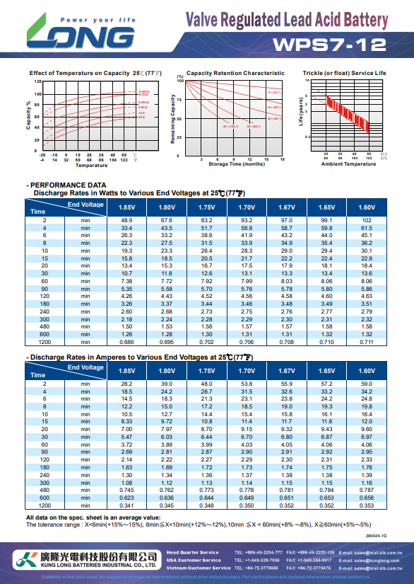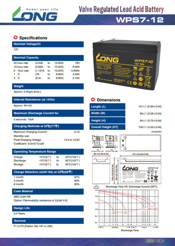 The Long Lead Acid Battery 12V 7Ah WPS7-12 is a reliable and durable power source for a variety of applications. Its 7Ah capacity ensures stable performance for UPS systems, emergency lighting, security alarms, and backup devices. Advanced lead-acid technology provides efficient recharging and consistent energy output.